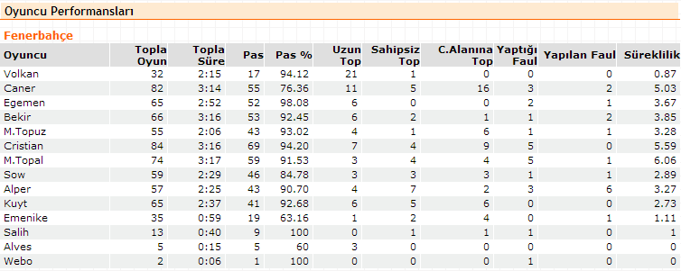 FENER'İN AÇIK ARA İSTATİSTİKLERİ